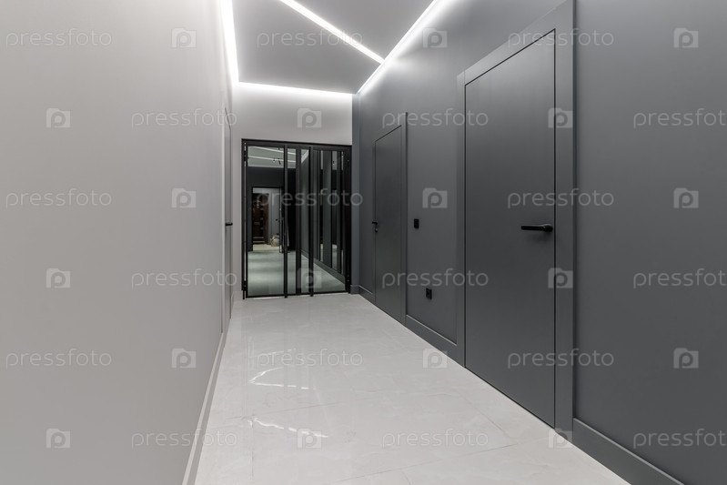 Простой чистый недавно построенный универсальный современный новый жилой дом с интерьером, длинный черный коридор с черными дверями, перспектива. Новая купленная квартира, новый дом, абстрактная концепция прихожей, пространство для копирования