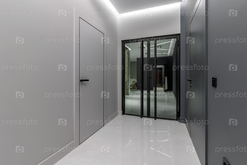 Простой чистый недавно построенный универсальный современный новый жилой дом с интерьером, длинный черный коридор с черными дверями, перспектива. Новая купленная квартира, новый дом, абстрактная концепция прихожей