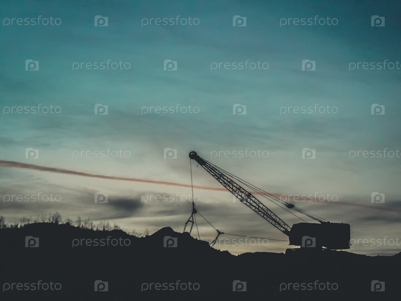 Размытый силуэт старого экскаватора на краю глиняного карьера на фоне вечернего неба. Селективный фокус, зерно пленки
