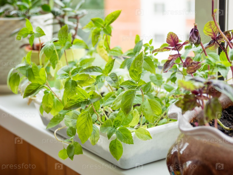 Домашнее садоводство. Рассада базилика в цветочном горшке на подоконнике. Комнатные растения