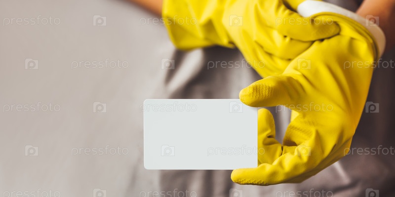Мужчина в сером халате надевает желтые резиновые перчатки и держит белую карточку с копией пространства. Услуги по уборке помещений или объявление о продаже в магазине хозяйственных товаров и продукции растениеводства
