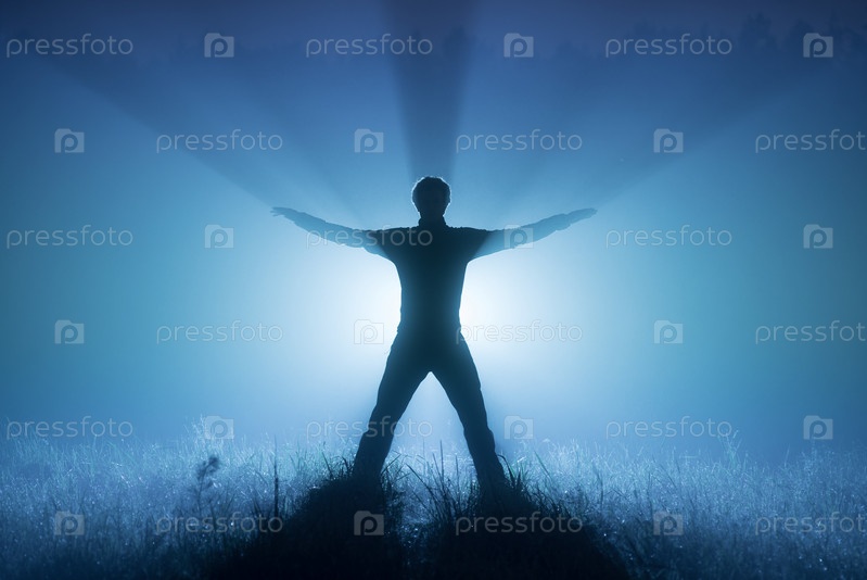 Туманная ночь. Синие тона. Силуэт мужчины. Мужчина поднял руки вверх. Прожектор позади человека