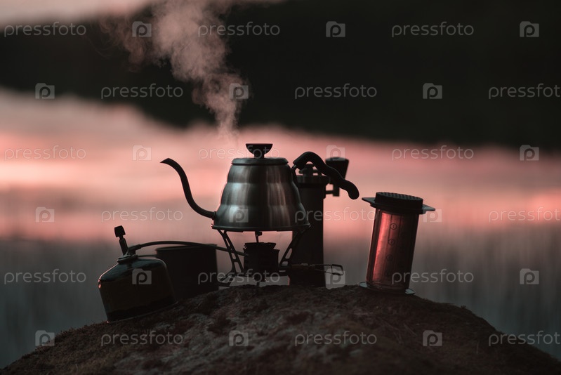 Кипящий чайник и принадлежности для кофе или чая вечером или утром