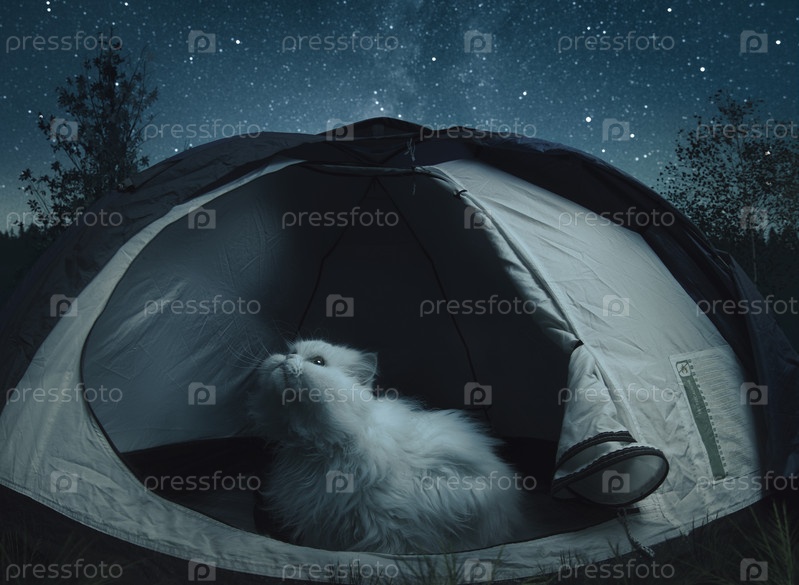 Большой белый кот сидит в палатке и смотрит на звезды. На открытом воздухе. Свет луны