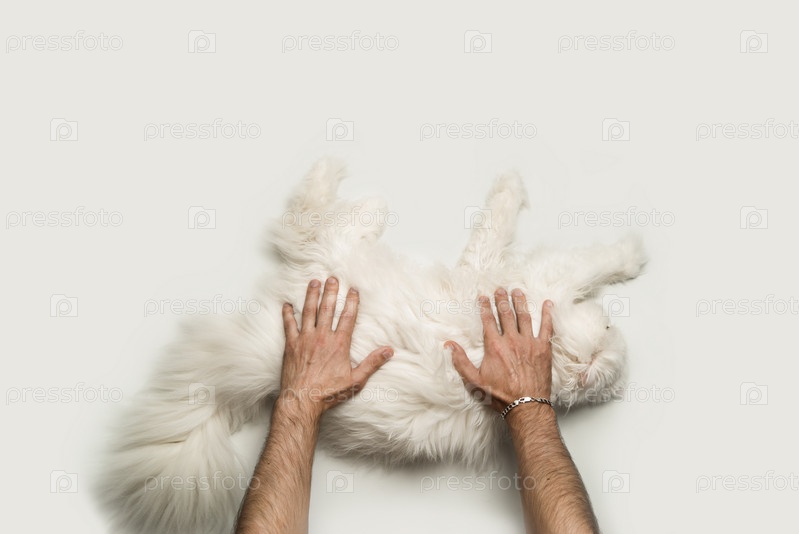 Мужчина гладит большую пушистую белую кошку. Вид сверху. Светлый фон