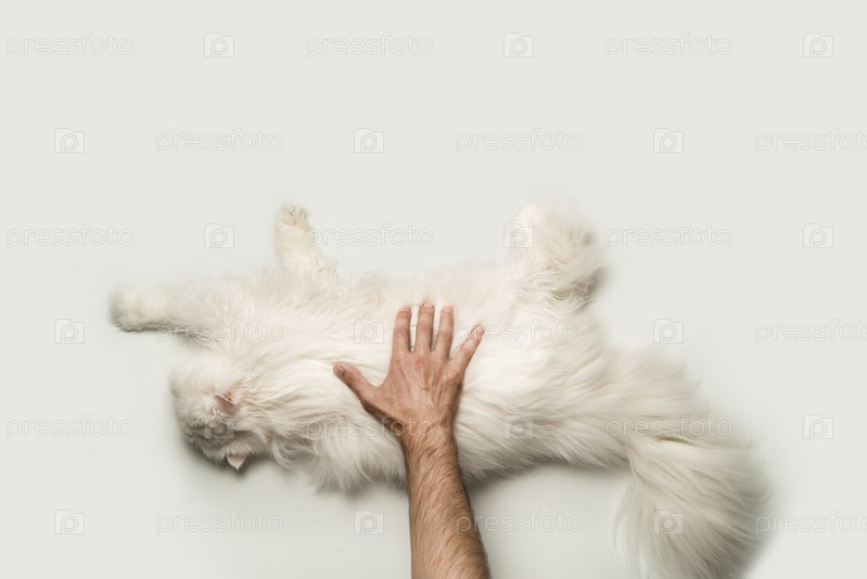 Мужчина гладит большую пушистую белую кошку. Вид сверху. Светлый фон