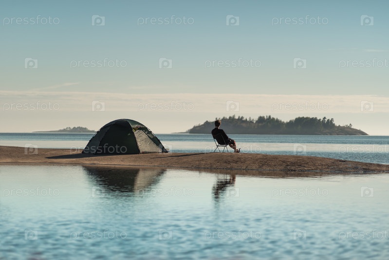 Мужчина сидит на стуле на острове и любуется прекрасным видом