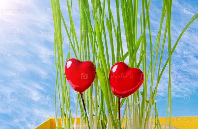 Два декоративных сердца в горшке с проросшим овсом в желтой деревянной коробке на фоне голубого неба с облаками. Открытка на День святого Валентина