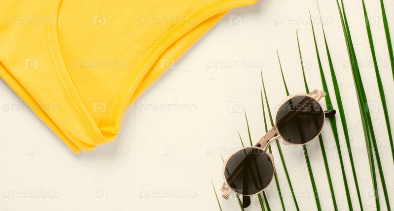 Круглые солнцезащитные очки, пальмовый лист и желтая футболка на белом. Летняя модная квартира. Тонированное изображение