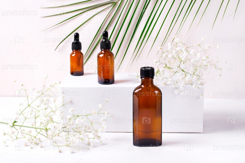 Косметические бутылки на белом подиуме. Шаблон презентации натуральных косметических средств