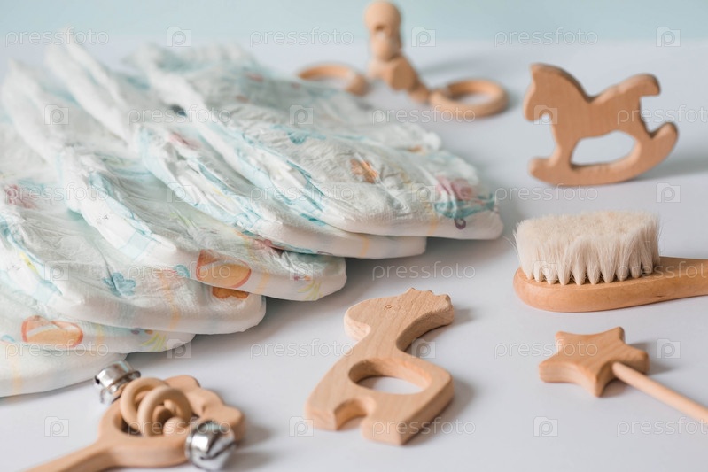 Деревянные игрушки, стопка подгузников и детские принадлежности на пеленальном столике. Место для текста