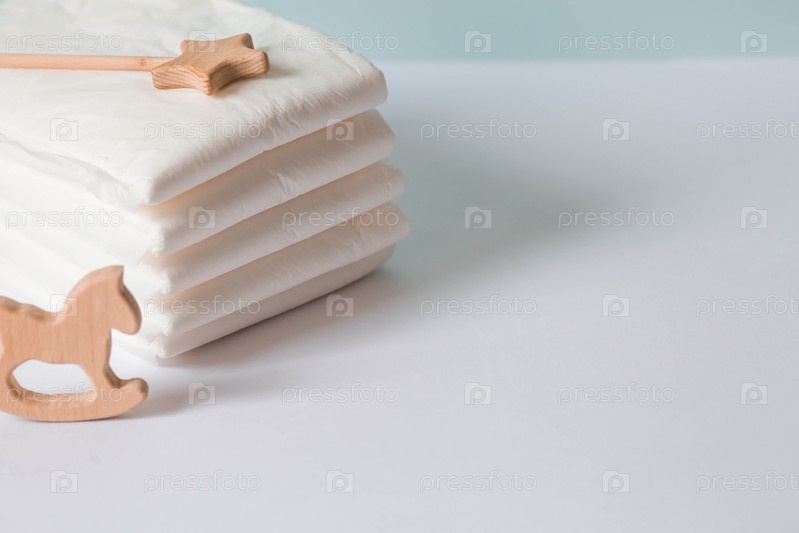 Деревянные игрушки, стопка одноразовых подгузников и детские принадлежности на пеленальном столике. Место для текста