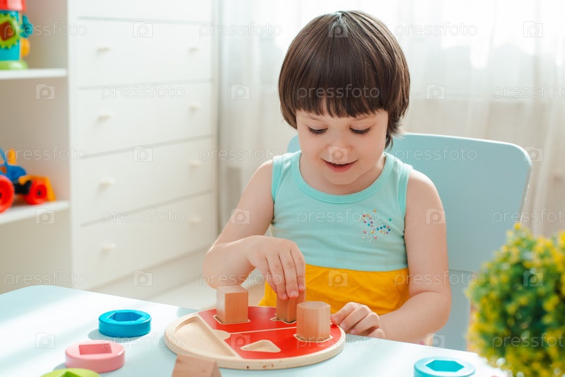 Маленькая девочка собирает деревянную неокрашенную пирамиду. Безопасные детские игрушки из натурального дерева