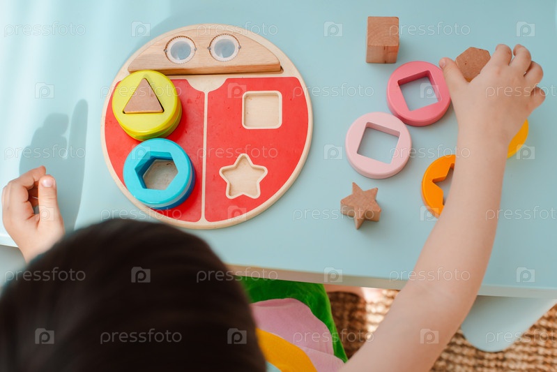 Маленькая девочка собирает деревянный разноцветный сортировщик Безопасные детские игрушки из натурального дерева Развивающая игра