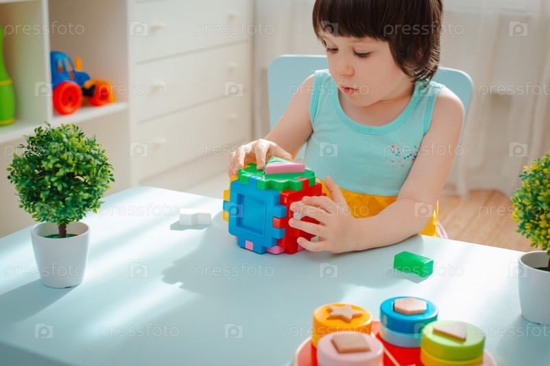 Крупным планом руки ребенка собирают сортировщик головоломок. Куб со вставленными геометрическими фигурами и цветными пластиковыми блоками