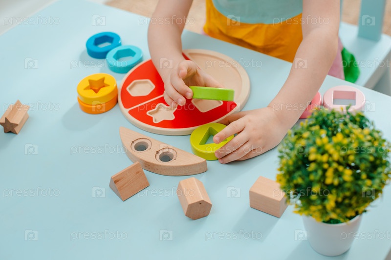 Маленькая девочка собирает деревянный разноцветный сортировщик Безопасные детские игрушки из натурального дерева Развивающая игра