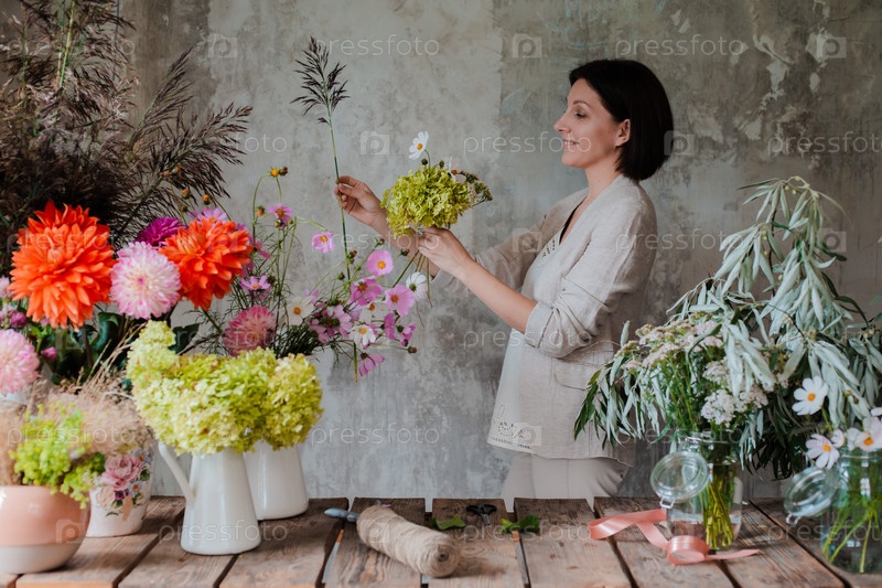Женский профессиональный флорист готовит композицию из полевых цветов