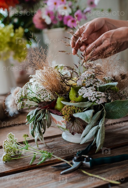 Женский профессиональный флорист готовит композицию из полевых цветов