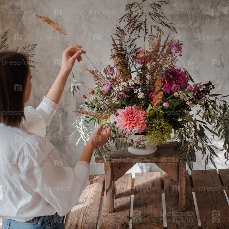 Женский профессиональный флорист готовит композицию из полевых цветов