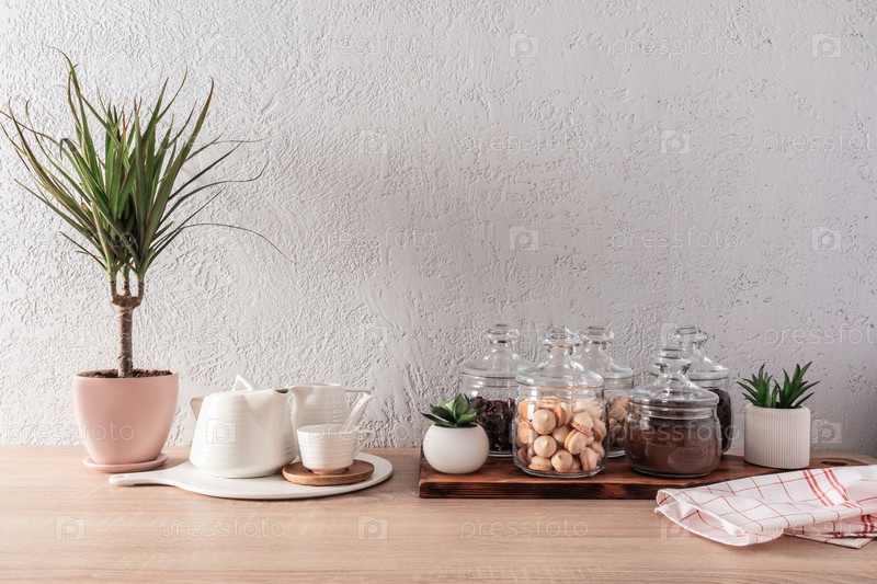 Интерьер кухни, фон. стеклянные банки с сухим чаем, печеньем, кофейными зернами, белым керамическим чайником и чашками. Растения. передний план