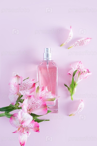 Шикарная бутылка женских духов или косметический спрей на розовом вертикальном фоне среди нежных цветов астромерии. презентация аромата