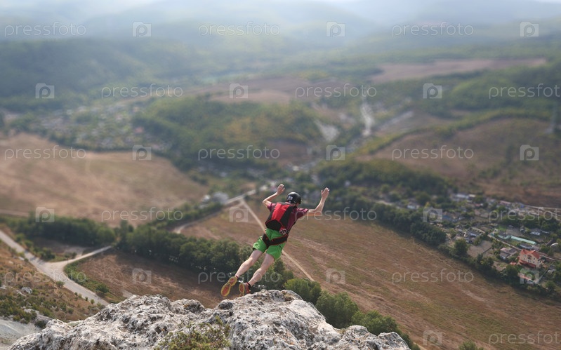 Мужчина прыгает со скалы в горах