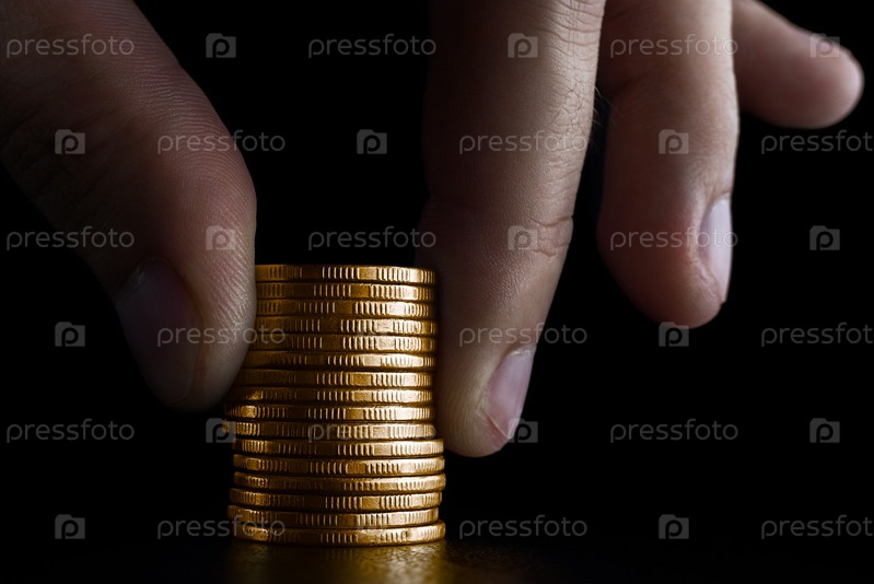 Стопка золотых монет и мужская рука