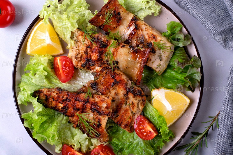 Кусочки осетра на гриле подаются со свежим салатом, помидорами черри и лимоном. Изысканное рыбное блюдо. Вид сверху