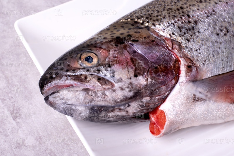 Голова радужной форели на белой тарелке Рыба Mykiss Oncorhynchus