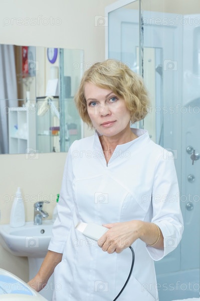 Косметолог готовится к аппаратной процедуре ультразвуковой чистки кожи лица. Косметический уход за лицом. Эффект лифтинга
