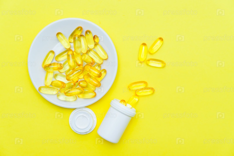 Добавка рыбьего жира, концепция медицины и здоровья, вид сверху на мягкие гелевые капсулы на желтом фоне