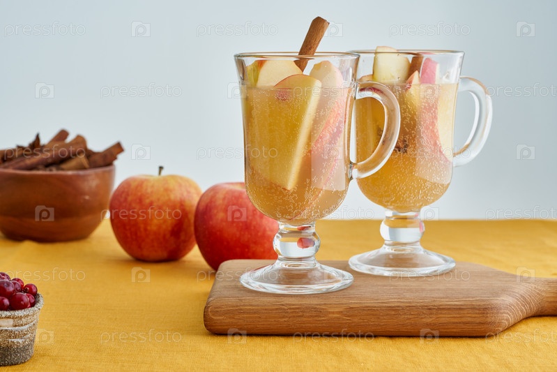 Горячий сезонный зимне-осенний алкогольный яблочный напиток. Белый глинтвейн на льняной скатерти оранжевого цвета