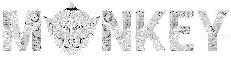 Слово обезьяны с головой животного. векторный объект zentangle для окраски