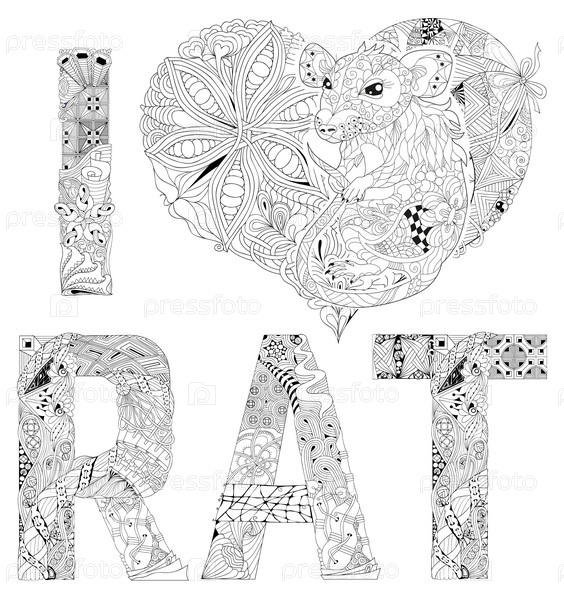 Я люблю крысу с рисунком крысы. Векторная иллюстрация ручной работы для раскраски