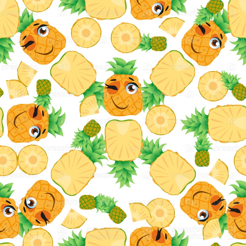 Бесшовный узор из экзотических фруктов ананаса. Смешные милые лица персонажей