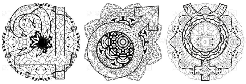 Астрономические знаки с мандалами, концепт-арт астрологии. Дизайн татуировки. Юпитер, МАРС и Меркурий для раскрашивания
