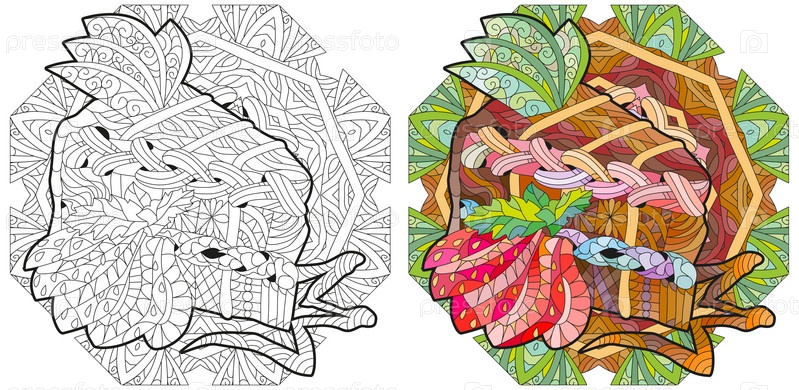 Векторный кусок торта с абстрактными орнаментами на узорчатой круглой подложке для окраски. Ручная иллюстрация к футболку в стиле зентенгл, каракули. Набор цветов и контуров