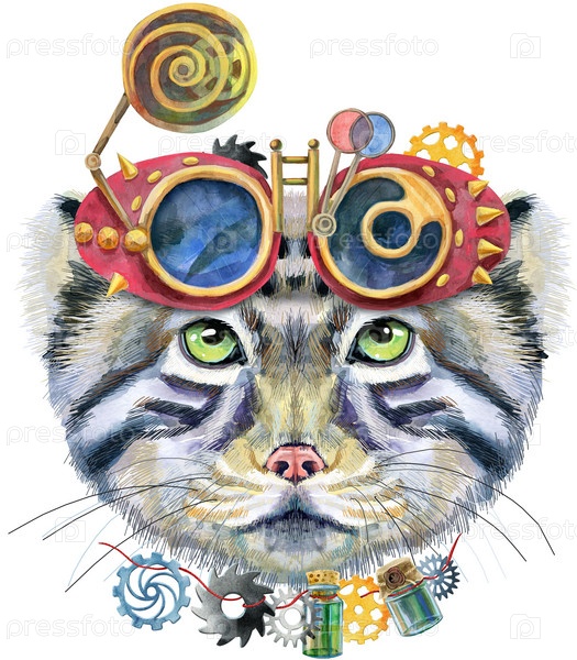 Акварельный рисунок животного - кошачий манул в очках, эскиз