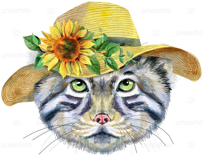 Акварельный портрет кота Манула в летней шляпе на белом фоне