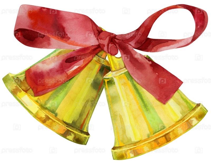 Золотые акварельные рождественские колокола с красным бантом. Символ счастливого Рождества и Нового года