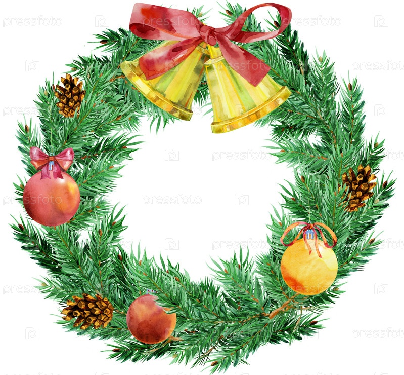 Традиционный рождественский венок из сосны с золотыми колокольчиками. Мультфильм акварелью и тушью эскиз. Ручная иллюстрация
