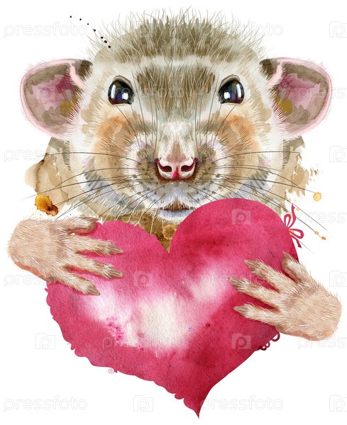 Акварельный портрет крысы с розовым сердцем