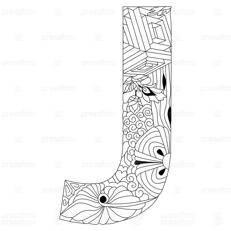 Стилизованный алфавит Zentangle - буква J для окраски. векторная иллюстрация. этнический узор