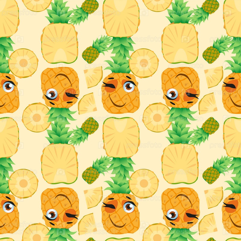 Бесшовный узор из экзотических фруктов ананаса. Смешные милые лица персонажей