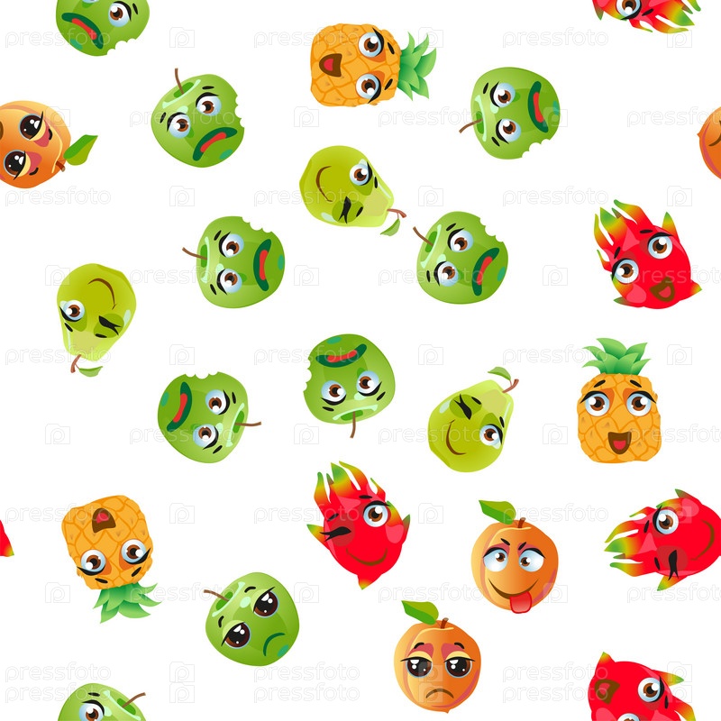 Бесшовный рисунок экзотических фруктов питахайя, груша, ананас, абрикос, яблоко, фрукты вишневый красный Смешные милые лица персонажа