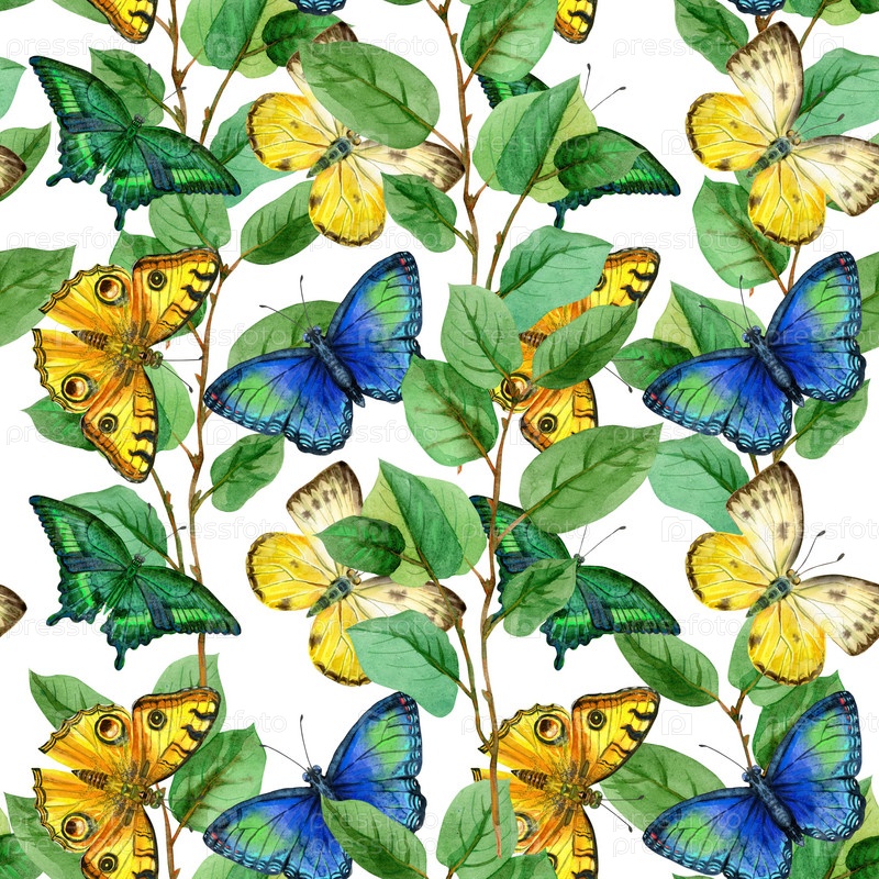 Цветочные листья бесшовный узор с красочными бабочками на белом фоне. Художественный дизайн цветочной печати для упаковки, текстиля, обоев, подарочной упаковки, поздравления или свадебного фона