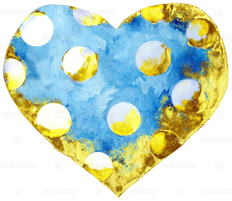 Акварельное голубое сердце с белыми точками и золотыми штрихами