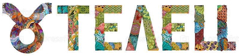 Знак зодиака Телец на русском, астрологический концепт-арт. Дизайн татуировки. Набор цветов и контуров