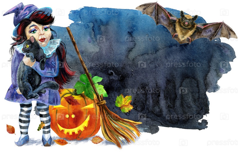 Праздник Хэллоуина маленькая ведьма и кошка на черном фоне