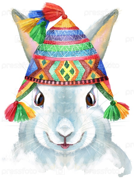 Симпатичный белый кролик в перуанской шляпе на белом фоне с брызгами, изолированный